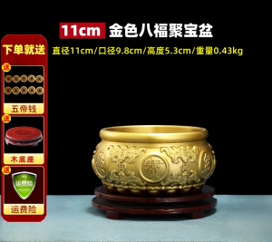 【金色】八福聚宝盆 直径11厘米 送底座+五帝钱等
