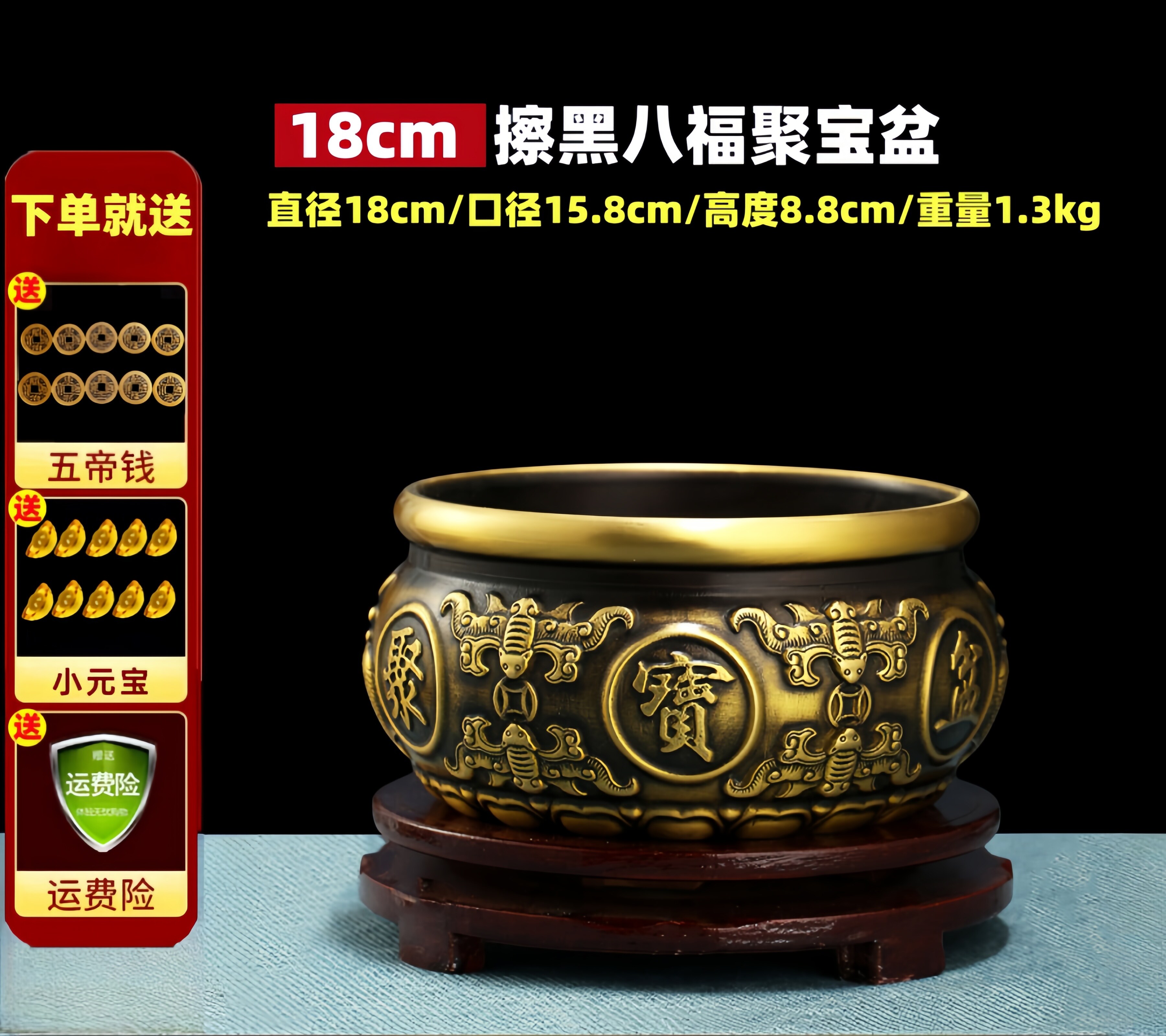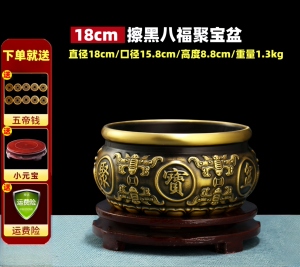 【擦黑】八福聚宝盆 直径18厘米 送底座+五帝钱等