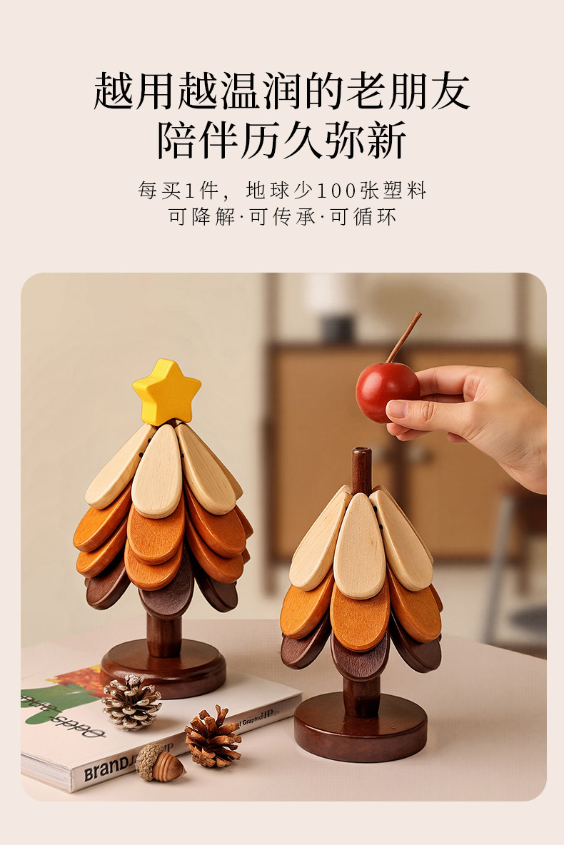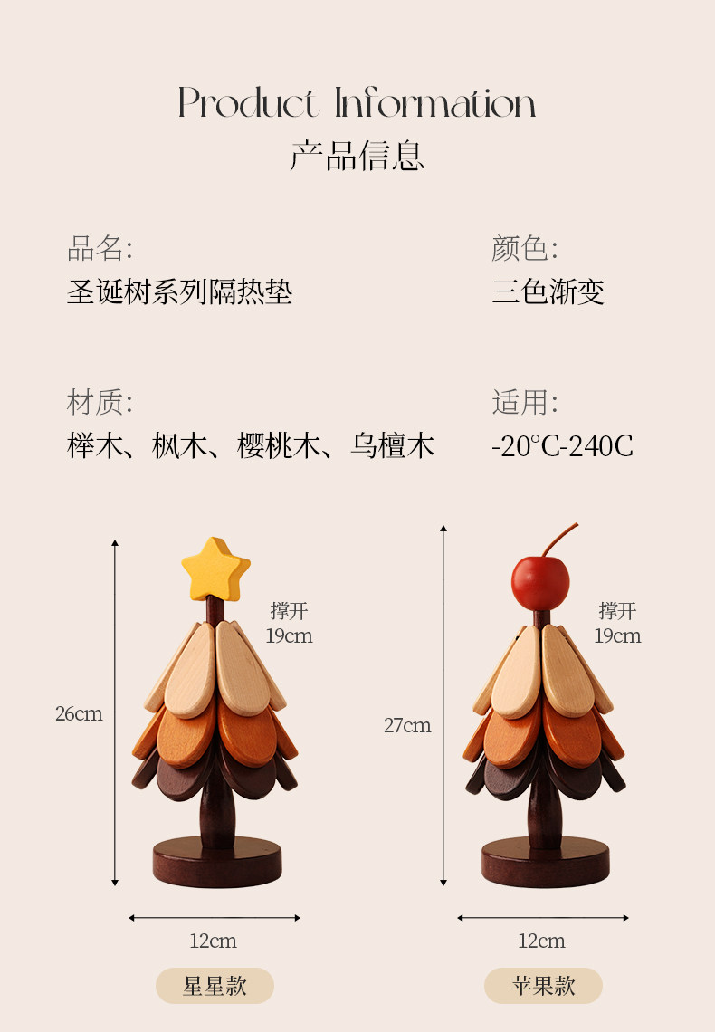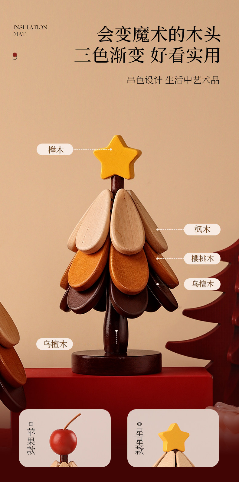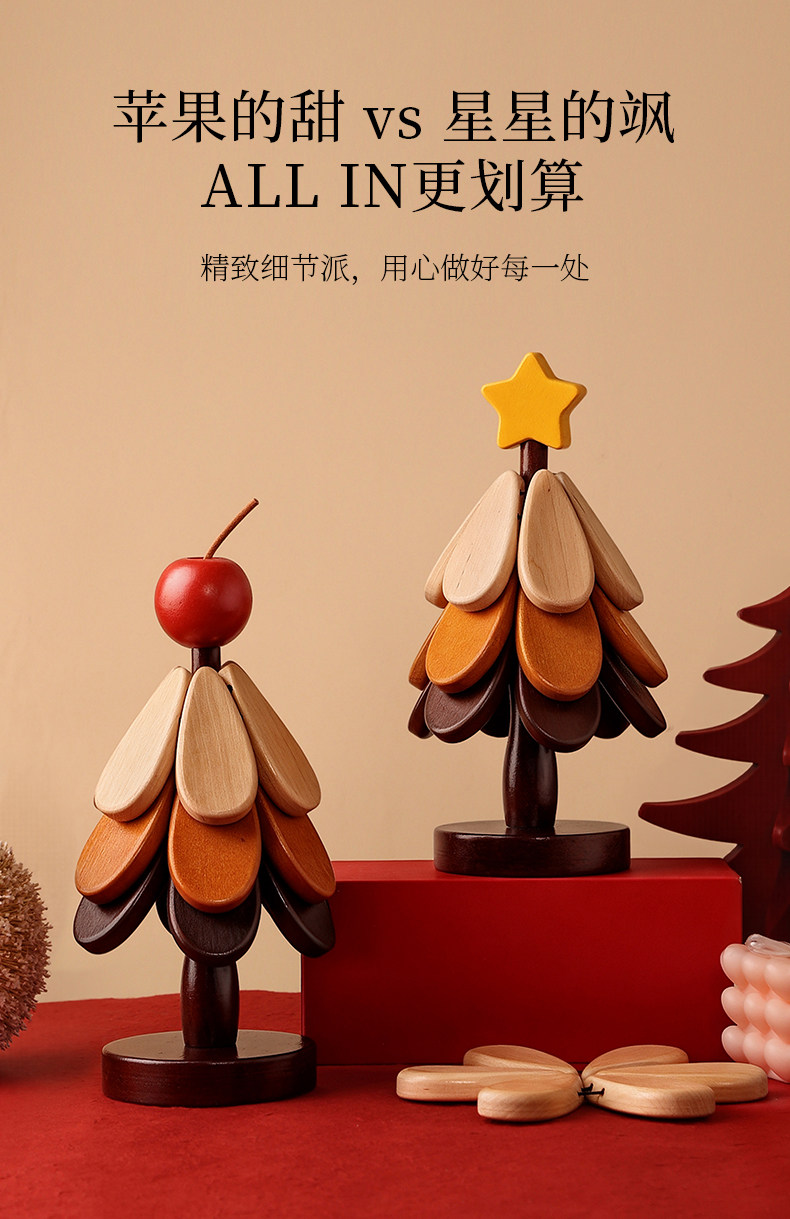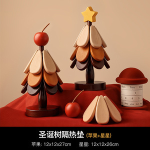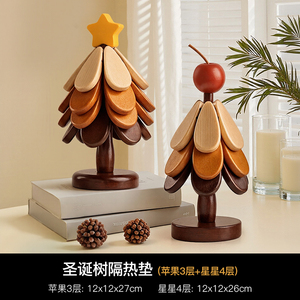 【苹果+星星】圣诞树四层隔热垫两件套【全实木材质 防烫耐高温】